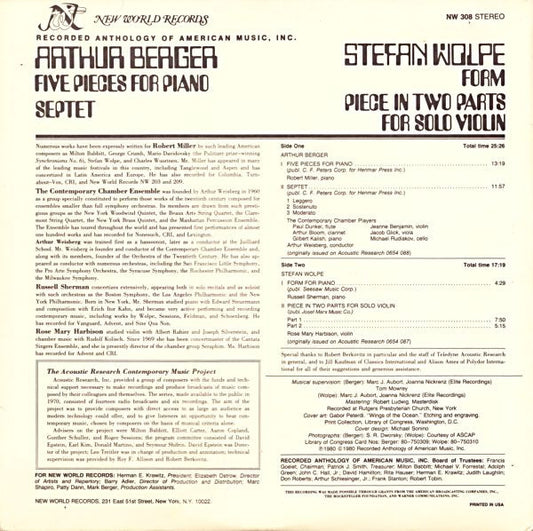 Arthur Berger / Stefan Wolpe - Five Pieces For Piano / Septet / Form / Piece In Two Parts For Solo Violin, 1980